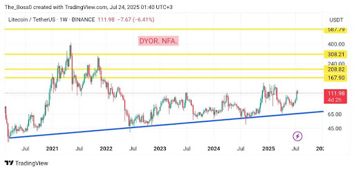The Boss, a crypto analyst, recently noted on a X post that Litecoin (LTC) is firmly holding its long-term upward trend that began back in 2020. According to his analysis, LTC has consistently bounced off this key ascending trendline, highlighting its ongoing relevance in the current market structure.