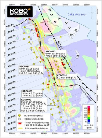 A second set of holes, KDD0091 to KDD0093 (see Figure 3), targeted an area of artisanal mining previously trenched and sampled by the Company, which returned strong gold mineralization including trench KTR070 with 28.0 m at 4.44 g/t Au and trench KTR069 with 6.0 m at 2.50 g/t Au ( see press release dated December 5, 2023 ). Previous diamond drilling on this target also confirmed strong mineralization, including hole KDD0012 , which intersected 11.0 m at 1.71 g/t Au from 50.0 m ( see press release dated July 11, 2024 ).