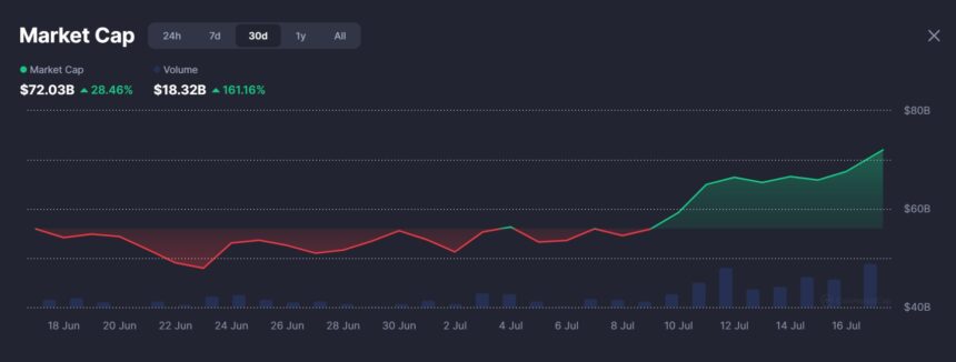 CoinMarketCap data showed that July has seen bigger trading volumes for memecoins than the previous month, with the sector’s 24-hour trading volume peaking at over $18 billion on Thursday. Its second-highest trading volume in the last 30 days was $17.09 billion on Saturday.