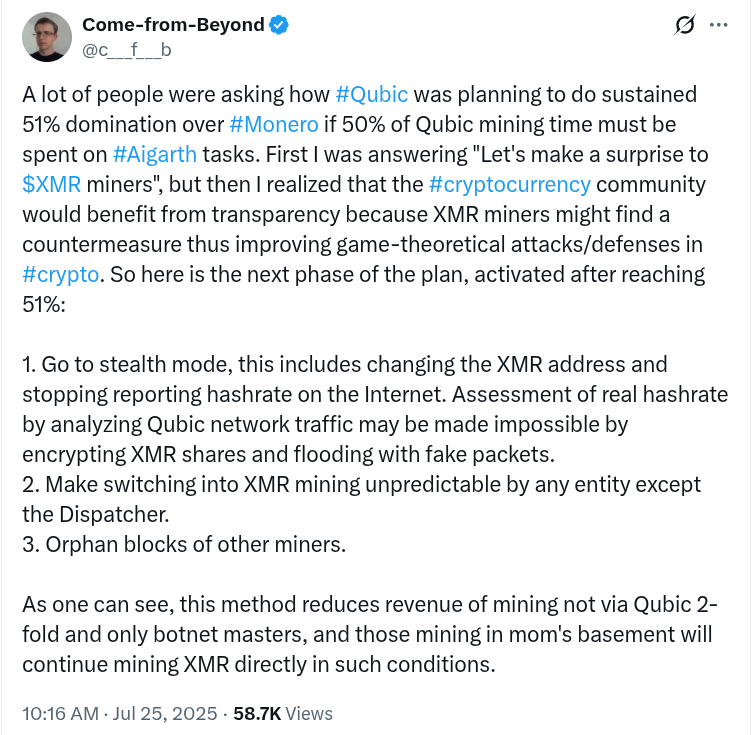 Dadybayo added that, while Qubic claims to have no intention to hurt Monero, “intent doesn’t matter.” He explained that centralization equals risk, and censorship potential is damaging to the network, concluding that incentives are a new attack vector: