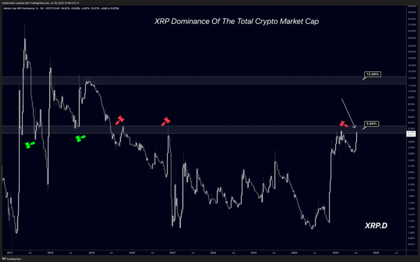 “This means that any closure above 5.75%, which aligns with the Fib levels of 0.5 and 0.618 (8.59%), could trigger the Kaboom phase for #XRP Dominance!”
