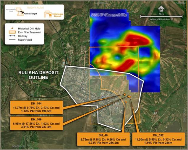 The Rulikha Deposit and geophysical targets are situated about 33km northwest from East Star’s 100% owned Verkhuba Deposit (JORC MRE of 20.3Mt @ 1.16% copper, 1.54% zinc and 0.27% lead). Located within the Rulikhinskoe-Vydrikhinskoe Ore Field in the Shemonaikha District of East Kazakhstan, the Rulikha Deposit is a VMS polymetallic deposit primarily explored for zinc, copper and lead. The Rulikha Deposit was part of a broader geological exploration effort in the region, conducted by the East Kazakhstan Geological Exploration Expedition under the Ministry of Geology of the USSR and later the Republic of Kazakhstan.