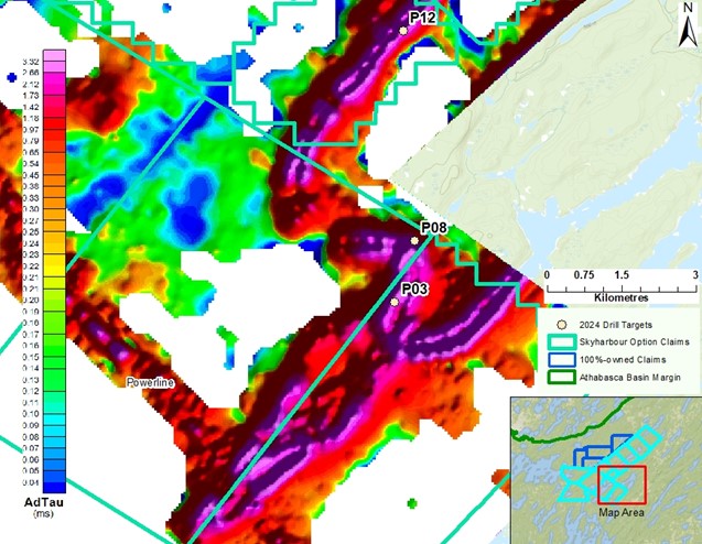 Figure 1: Electromagnetics with 2024 drill targets P03, P08 and P12. Processing by Condor North Consulting ULC using 2006 and 2007 airborne data.