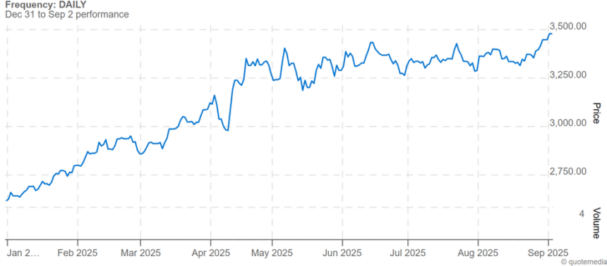 Gold price chart, January 1, 2025, to September 2, 2025.