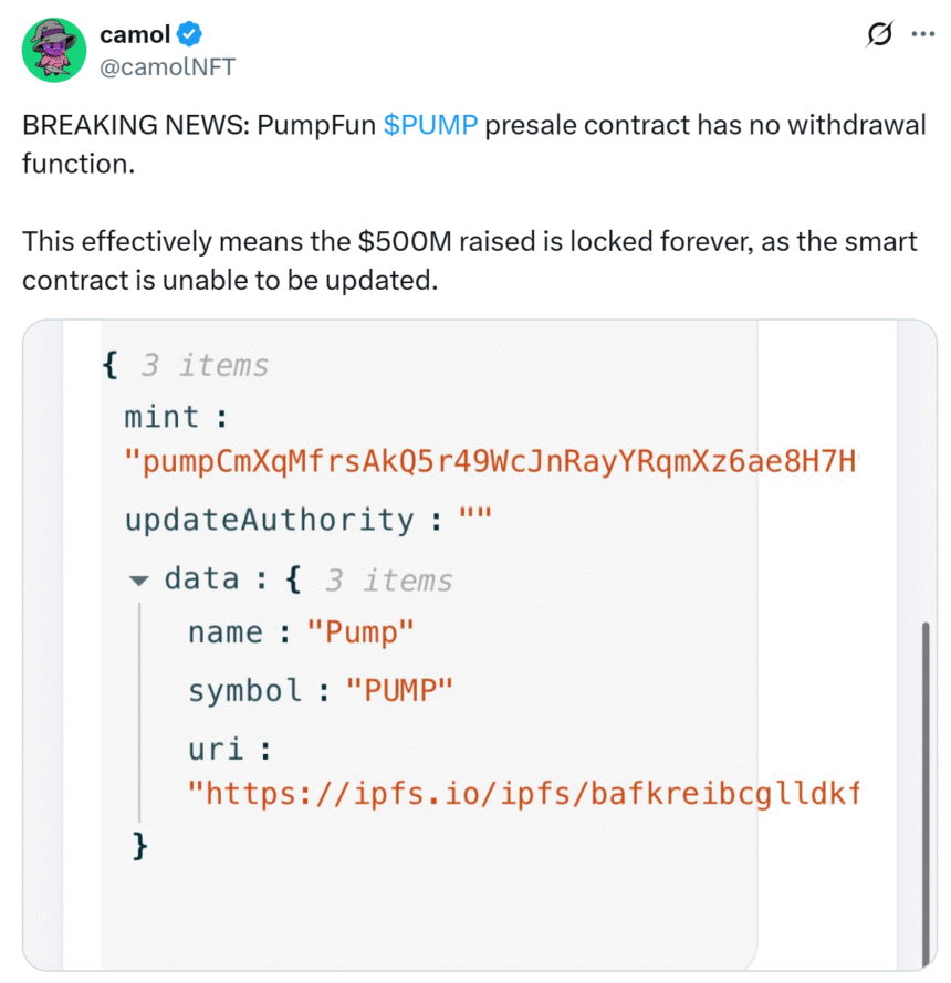 Over the weekend, X user camol claimed that the Pump.fun’s $PUMP presale contract lacked a withdrawal function, suggesting that the raised funds were locked forever because the smart contract was immutable.