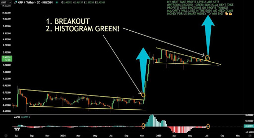 The Falling Wedge pattern has held XRP in a tight consolidation phase for an extended period, particularly evident on the weekly chart. JD considers this formation historically bullish when broken to the upside, and XRP is apparently nearing a pivotal point where a breakout could be imminent. Notably, a successful breach of this Falling Wedge pattern would signal renewed bullish momentum and potentially spark a rally toward uncharted price territory.