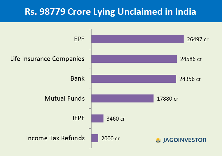 Can you believe that a whopping Rs 98,779 crore is lying in various investment products in India like banks, EPF, PPF, Mutual funds, LIC, and many other entities!!