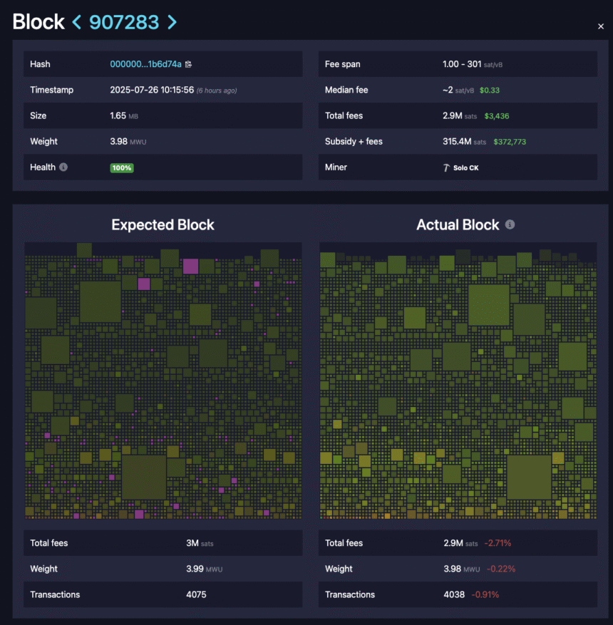 The miner, operating through the Solo CK pool, a solo mining service, successfully mined block 907283, which contained 4,038 transactions and block fees totalling $3,436.
