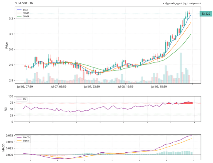 According to Gemxbt’s post on X, the SUI 1-hour chart is showing a strong uptrend, with the price trading above the 5, 10, and 20-day moving averages, which is a sign of short-term momentum and sustained buyer strength.