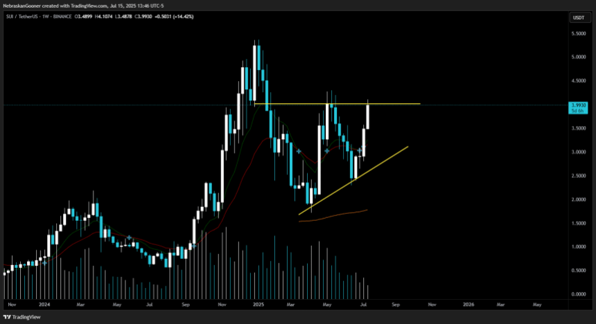 Over the past 24 hours, SUI has soared nearly 15% from the $3.50 support toward the $4.00 resistance, breaking out of a triangle formation and potentially setting the stage for a massive breakout.