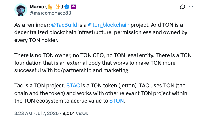 According to Tac co-founder Marco Monaco, Tac is a project built on TON that features its own jetton TON token and works with other projects within the TON ecosystem to “accrue value to TON.”