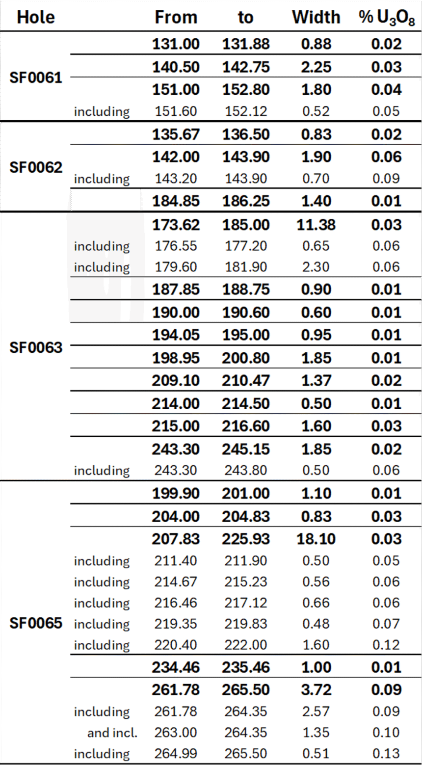 The northernmost hole, SF0067, returned 3.87 m at 0.05 %U3O8, including a sub interval of 0.17 %U3O8 over 0.5 m. This 0.5 m interval represents the best sample of the program. Another interval within this hole returned 0.03 %U3O8 over 8.05 m with a 0.16 %U3O8 over 0.5 m interval within. The best intersections of the program, which are some of the better intersections for both grade and width within the deposit, are open to the north and the east.