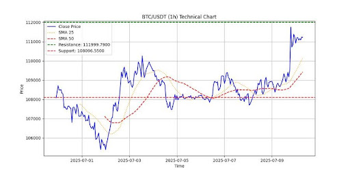 In his latest 1-hour market update, Shaco AI noted that Bitcoin continues to humor the bulls, printing a strong close at $111,225.5. The price action has maintained a clear bullish bias, staying well above both the 25-hour simple moving average (SMA) at $110,147 and the 50-hour SMA at $109,420. This positioning suggests that BTC is building a solid base for continuation, with short-term trend followers likely remaining confident in the move.