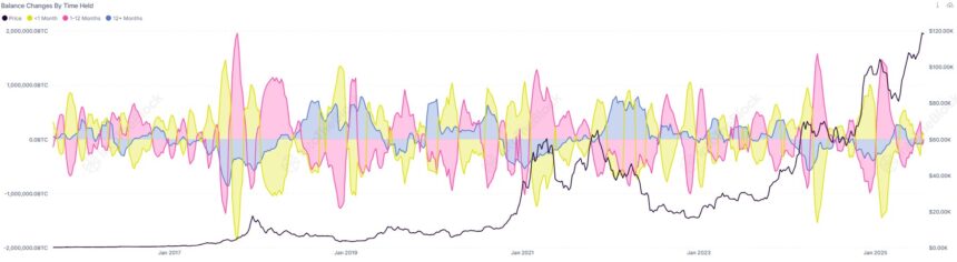 In a new post on X, institutional DeFi solutions provider Sentora (formerly IntoTheBlock) has shared a chart that shows how the holdings of the different Bitcoin investor groups has changed over the years. The cohorts in question have been divided on the basis of holding time.