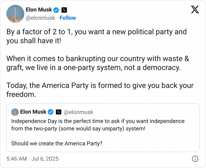 Musk posted to his X platform on Sunday that he was forming the “America Party.” He had promised to create it if Congress passed Trump’s massive tax and spending bill, which it did on Thursday.