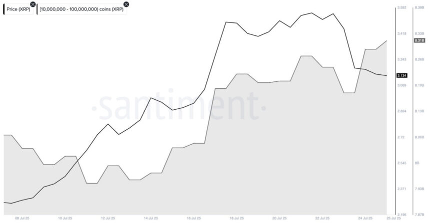 For instance, Santiment’s Supply Distribution metric shows a steady rise in the supply held by entities with a 10 million–100 million balance. These addresses now own 8.31 billion XRP, a new monthly high. This represents 14% of the total XRP circulating supply.