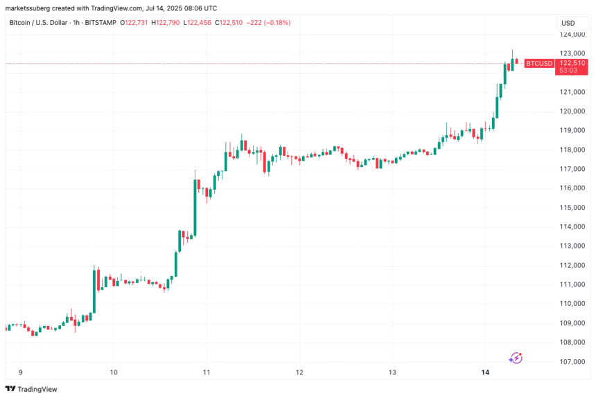 BTC price strength shows no signs of reversing as $123,000 appears for the first time after the weekly close.