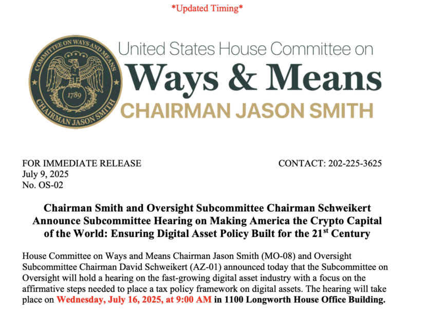 In a Wednesday notice, leadership on the House Committee on Ways and Means and Oversight Subcommittee said they had scheduled a July 16 hearing to focus on “affirmative steps needed to place a tax policy framework on digital assets.” The event, “ensuring digital asset policy built for the 21st century,” will come as House representatives are expected to vote on three crypto-related bills.