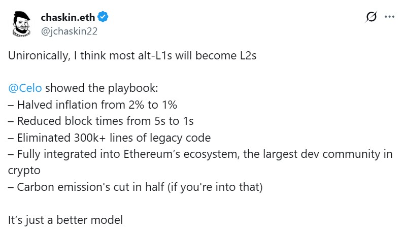 On Monday, Jason Chaskin, who leads app relations and research at the Ethereum Foundation, sparked a conversation after saying that most layer-1s will become Ethereum layer-2s. He pointed to Celo’s recent transition as a blueprint.