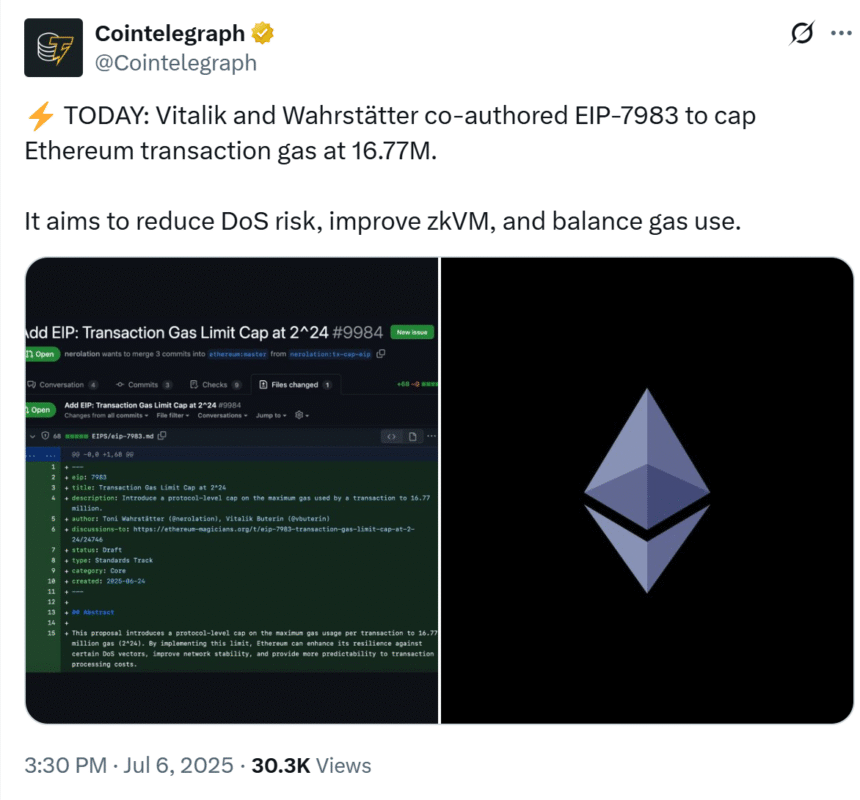 Ethereum co-founder Vitalik Buterin and researcher Toni Wahrstätter have put forward EIP-7983, which aims to introduce a protocol-level cap on transaction gas usage to increase network security and performance.