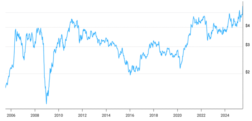 Taking a look back at historical price action, the copper price has had a wild ride for more than two decades.