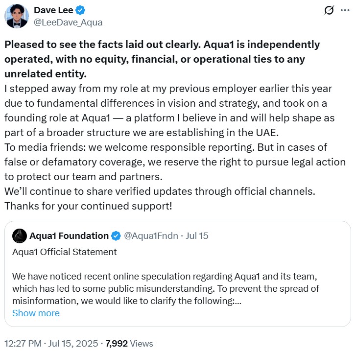 Lee attempted to distance himself from Web3Port, stating that he stepped away from his former role at his “previous employer” due to “fundamental differences in vision and strategy.” However, he hasn’t explicitly denied that he is David Li or that Aqua1 is somehow connected to Web3Port.