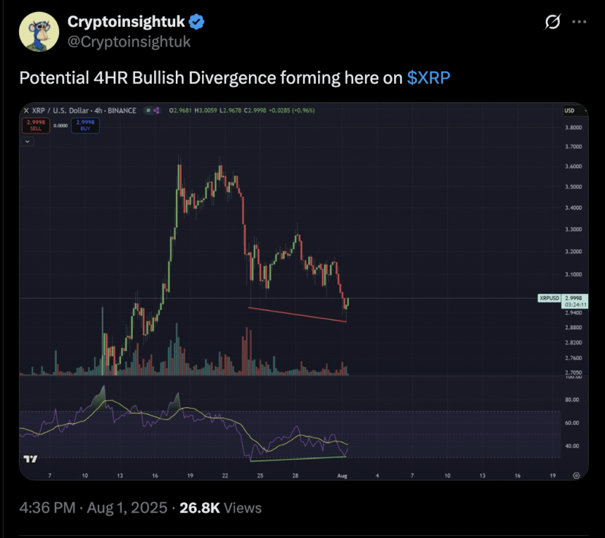 On its four-hour candle chart, XRP shows a bullish divergence, a common signal often hinting at a potential trend reversal.